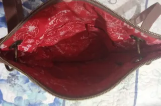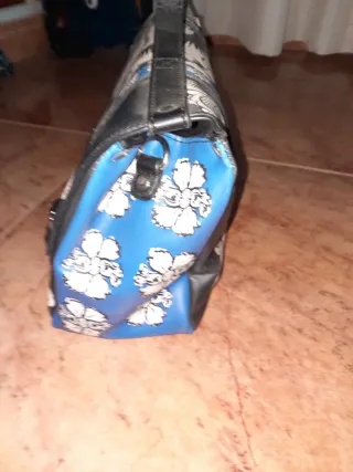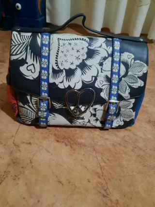 Bolso de estilo vintage con un diseño llamativo y original. Tamaño ideal. Sin estrenar - Estampado floral y de corazones. - Cierre con hebillas decorativas. - Asa de mano y correa para colgar. - Detalles en azul y rojo.
