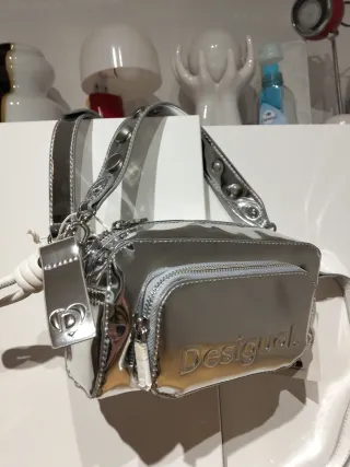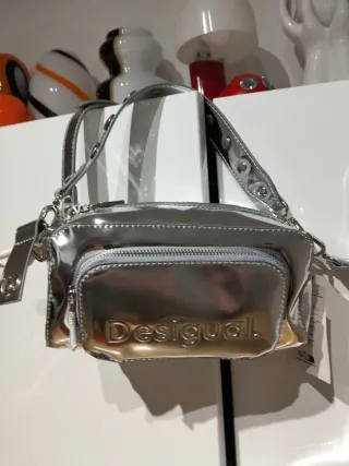 Bolso de la marca Desigual con un acabado brillante. - Diseño moderno y llamativo. - Correa ajustable. - Compartimento frontal con cremallera.