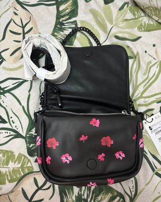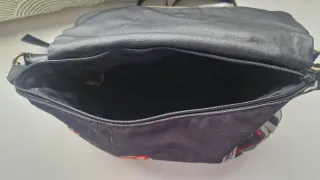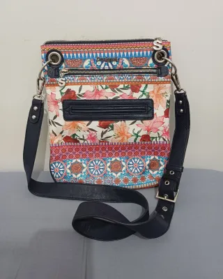 Bolso Desigual con un vibrante estampado floral. - Diseño llamativo con flores en varios colores. - Correa negra. - Cierre de cremallera.