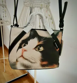 Bolso Desigual con un llamativo estampado de gato. Asas cortas de bolso de mano y correa para usar como bandolera - Diseño frontal con la cara de un gato. - Combinación de colores negro y multicolor.