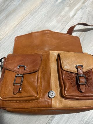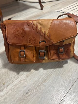 Bolso bandolera de cuero con diseño patchwork. Ligero desperfecto en la tira por la zona del hombro Gran capacidad y numerosos bolsillos - Combinación de tonos marrones y beige. - Detalle de bordados circulares. - Cierre con hebillas metálicas. Mide 32cm de ancho, 16cm de fondo y 20cm de alto.