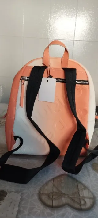Mochila con un diseño moderno y llamativo. - Acabado en relieve con el logo de la marca. - Combinación de tonos naranjas y beis clarito. -Con departamento interior y otro en la parte exterior. -Medidas aprox 30×25