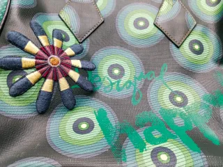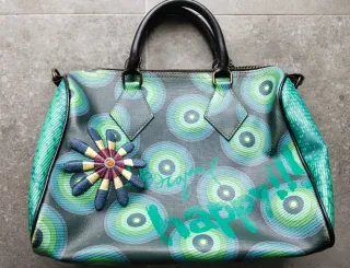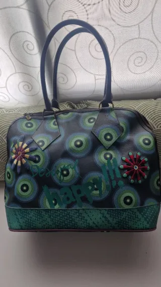Bolso Desigual con estampado circular en tonos verdes y azules, lleva detalle de flor bordada en la parte frontal. Bolso de mano, además trae una correa ajustable que se puede colocar para llevarlo al hombro o cruzado, según se prefiera. En el interior tiene varios departamentos tipo bolsillo abierto y otro con cremallera. Medida: ancho 32cm, alto 27 cm. Muy buen estado
