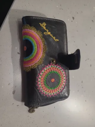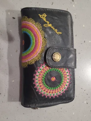 Monedero de la marca Desigual con un diseño llamativo. - Cierre de botón a presión. - Detalle de bordados circulares y arcoíris. - Logo de la marca en el cierre. - Con distintas separaciones para tarjetas, monedas, billetes... Apenas ha tenido uso