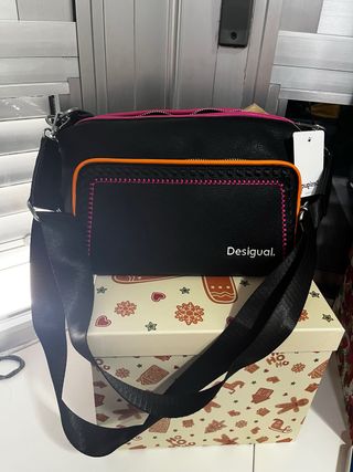 Bolso bandolera Desigual con detalles en contraste. - Cierre principal con cremallera. - Bolsillo frontal con cremallera. - Correa ajustable para llevar al hombro o cruzado. - Ribete decorativo en naranja y rosa.