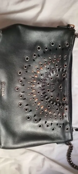 Bolso bandolera de la marca Desigual con detalles metálicos y cadena. - Diseño con perforaciones. - Acabado en negro y dorado.