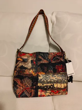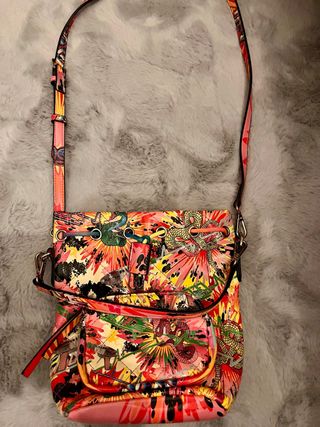 Bolso original Desigual con un diseño vibrante y llamativo. Excelente calidad. Antimanchas. Ligero y versatil. Asa ajustable para llevar en hombro o bandolera. Tambien de puede quitar para llevar en mano. Tutti Frutti. Entrego en mano so eres de Murcia o alrededores. Resto envio. Bolsillos exterior e interior. - Estampado abstracto y colorido. - Cierre de solapa y cremallera interior.