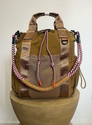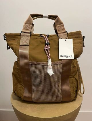 Mochila Desigual de color marrón con múltiples opciones de uso. - Cierre de cordón. - Asa de mano y correa. - Bolsillo frontal de malla. - Detalles de cinta y cuerda.