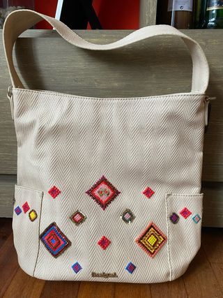 Bolso Desigual con un diseño patchwork muy original. - Combinación de texturas y colores. - Correa ajustable para llevar al hombro.