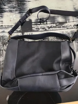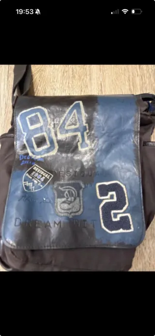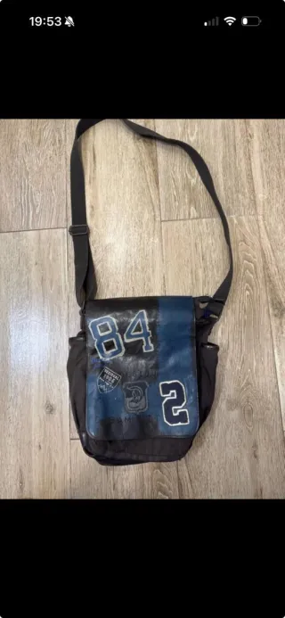 Bolso de hombro con un diseño moderno y llamativo. - Combinación de colores negro y azul. - Detalles con números y parches. - Correa ajustable para mayor comodidad.