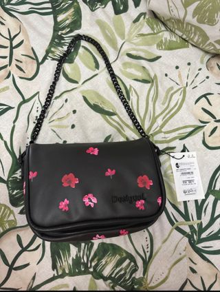 Bolso y cartera de la marca Desigual con un diseño floral. - Color principal negro. - Estampado de flores en tonos rosas. - Cadena negra para llevar al hombro.