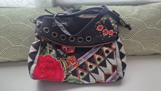 Conjunto de bolso y cartera de la marca Desigual. - Bolso grande con detalles de lentejuelas y bordados florales con signos de uso. - Cartera a juego con cierre de botón de regalo porque se ve muy gastada.