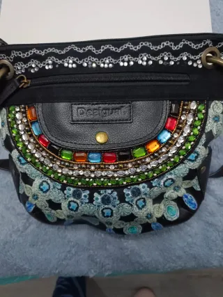 Bolso original Desigual en color negro con bordados tipo mandala en tonos rosa, verde y turquesa. Diseño muy bonito y combinable, ideal para looks informales. 👜 Tamaño mediano 🎒 Correa larga ajustable 🔒 Cierre con solapa y botón magnético ✨ Detalles troquelados y acabado trenzado decorativo 📦 Interior amplio y práctico 👉 Estado: Poco usado. Tiene algunas pequeñas zonas donde la piel/polipiel está caída o pelada (se aprecia en las fotos), pero no afecta al uso ni al cierre.