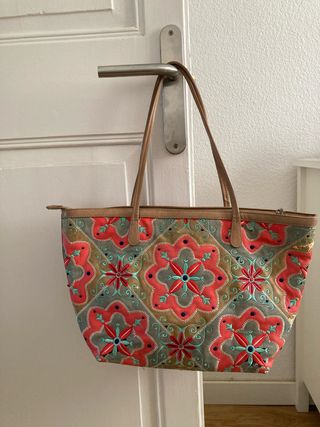 Bolso bandolera con un diseño llamativo y un color vibrante. - Adornado con un intrincado estampado floral. - Cierre de cremallera. - Correa ajustable para llevar al hombro o cruzado. Nunca usado, impecable. Precio original 49,90€