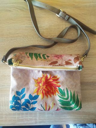 Bolso a estrenar pequeño, estampado floral, con doble abertura, dos compartimentos diferenciados con cremallera y en el grande dos bolsillos interiores, cierre metálico. Correa ajustable, se puede llevar cruzado.