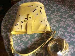Bolso de mano o bandolera con un diseño llamativo. - Color amarillo vibrante. - Detalles troquelados con motivos de hojas. - Incluye correa larga ajustable. MIRA LAS FOTOS 26,42€ unidad