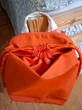 Mochila de la marca Desigual en llamativo color naranja. Nuevo con etiqueta, sin usar - Muchos compartimentos con cremallera. - Bolsillos antirobo. - Cierre con cordón. - Tirantes ajustables.