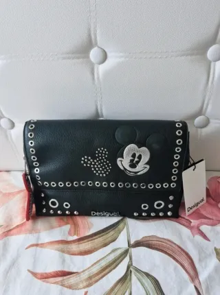 Bolso negro de la marca Desigual con un diseño inspirado en Mickey Mouse. Presenta detalles de tachuelas metálicas. - Adorno de Mickey Mouse en relieve. - Tachuelas plateadas alrededor del bolso. - Cierre de solapa. - Logo de Desigual en la parte frontal inferior. Nuevo a estrenar Precio en tienda 80€ No rebajo Entrega en mano usera O envío x aquí Gracias un saludo 👋 😉