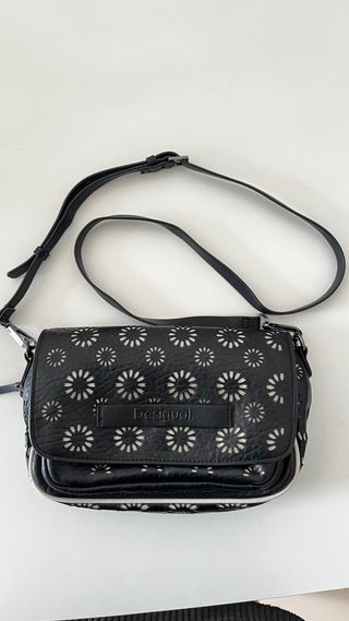 Bolso Desigual de tamaño mediano con un diseño único. - Acabado con perforaciones florales. - Correa ajustable para mayor comodidad. - Detalle de logo de la marca en la solapa.