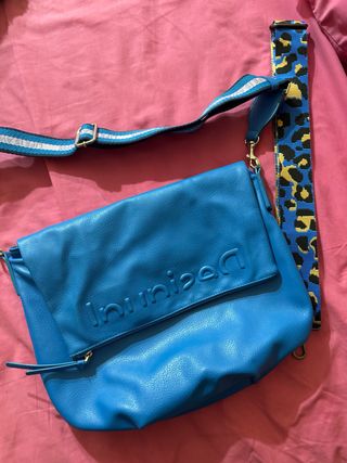 Bolso Desigual en un llamativo color azul eléctrico. Incluye dos correas intercambiables para variar tu estilo. - Correa principal con estampado de leopardo y detalles en azul y amarillo. - Correa secundaria con rayas blancas y azules. - Cierre de cremallera. - Logo de la marca en relieve en la solapa.