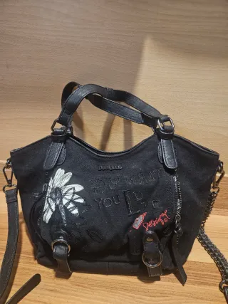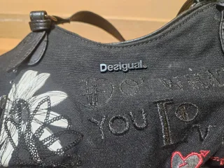 Bolso Desigual de color negro con un diseño llamativo. Producto original, en perfecto estado. Ideal para combinar con cualquier color. - Inscripciones y detalles bordados. - Cremallera lateral. - Asas superiores y correa ajustable.