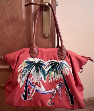 Bolsa de playa con un diseño veraniego y colorido. - Estampado de palmeras y una chica en una hamaca. - Asas de cuero marrón. - Cierre superior con cremallera. - Forro interior y varios bolsillos con cremallera.
