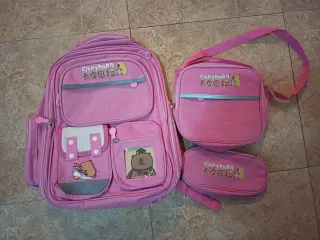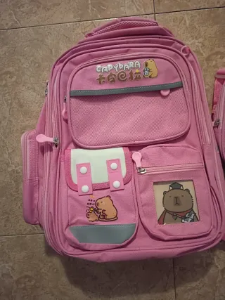 Conjunto de mochila, estuche y neceser con diseño de capybara. - Mochila principal con varios compartimentos. - Estuche a juego - Neceser a juego. - Adornos y dibujos infantiles.