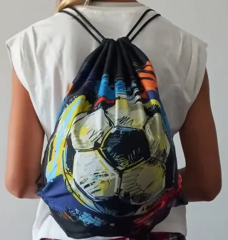 7 mochilas de cuerdas de tamaño 40 x 34 cm (perfectas para llevar el balón). De tela, con dibujo por los 2 lados #futbol #balondefutbol #bolsasdechuches