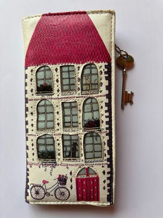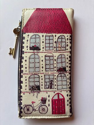 Cartera con un encantador diseño de casa y detalles. - Cierre de cremallera. - Llavero con forma de llave. - Ilustración de una casa con ventanas, gatos, bicicleta y puerta.