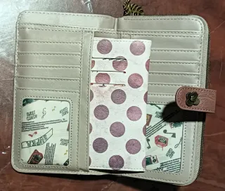 Cartera con un diseño encantador de una chica y mariposas. -billetera, tarjetero - Cierre de cremallera. - Estampado floral y de escritura. - Detalle de hoja colgante. -Nueva sin estrenar