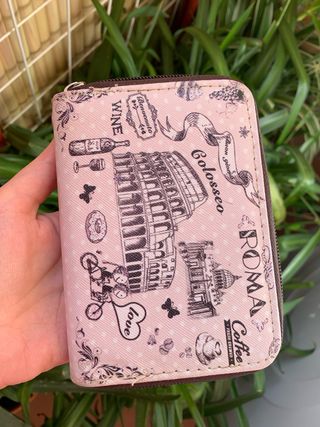 Monedero con un diseño inspirado en Roma, con dibujos de la ciudad y elementos como WINE, Colosseo, ROMA y Coffee. - Cierre de cremallera. - Estampado de lunares. - Dibujos de la Fontana di Trevi, el Coliseo y otros monumentos. - Incluye detalles como mariposas, bicicletas y corazones con la palabra love. ⚠️Envios por impost