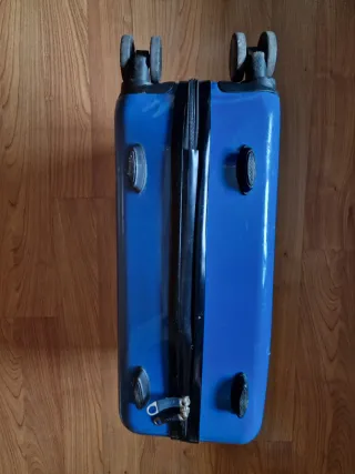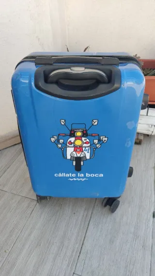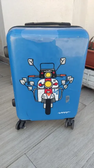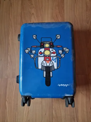 Maleta de cabina con un divertido diseño de moto. - Tamaño pequeño, ideal para viajes. - Color azul vibrante. - Ilustración de una moto estilo scooter en el frontal. - Asa retráctil y ruedas para facilitar el transporte. Una de las ruedas está rota. Tiene varios golpes y desconchones por el uso y uno de los tiradores de la cremallera se rompió e hice un "arreglo" sobre la marcha pero no afecta al cierre. Ver fotos bien.