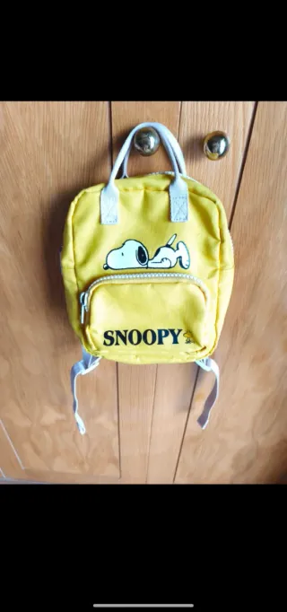 Mochila infantil 🎒 en color amarillo fuerte con dibujo de Snoopy, correas e interior rosa, bolsillo exterior, cierre con cremallera, . Medidas 20*21 cm. En buen estado.