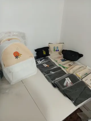 mochilas y neceser con estampados originales. - Mochilas con diseño de flor y figura. - Neceser con dibujo de matraz. - Bolsas negras con diseño de planta. - Bolsa con diploma.