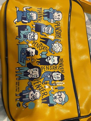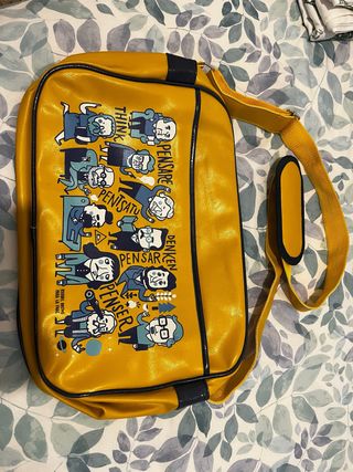Mochila bandolera de color amarillo con un diseño divertido de personajes. - Dibujos de pensadores y figuras históricas. - Ribetes en contraste. - Correa ajustable.