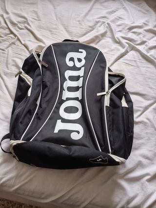 Mochila deportiva de la marca Joma. - Diseño en color negro con detalles blancos. - Logo de Joma en la parte frontal. - Incluye un pequeño dibujo de una zapatilla deportiva.