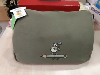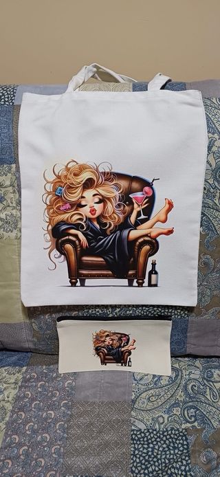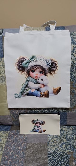 Set de bolsa de tela y neceser con un tierno diseño. Bolsa sola 12€ Neceser solo 6€ Conjunto 15€ - Bolsa de tela blanca con asas. - Neceser a juego con cierre de cremallera.