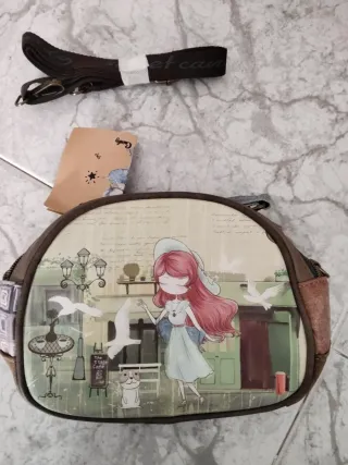 Este bonito bolsito tiene un diseño encantador con una chica, un perro y pájaros. - Cierre de cremallera. - Correa ajustable. - Detalle de pluma en el tirador de la cremallera.