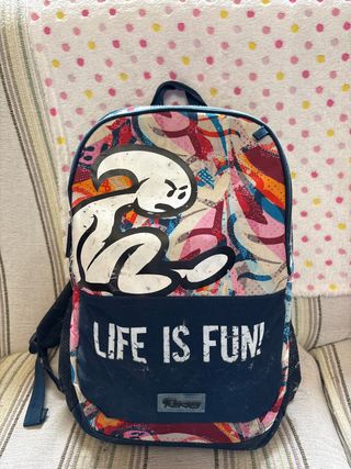 Mochila con un diseño llamativo y divertido. - Estampado abstracto y colorido. - Personaje gráfico blanco en la parte superior. - Inscripción LIFE IS FUN! en la parte frontal inferior. Se entregara completamente limpia y vacia