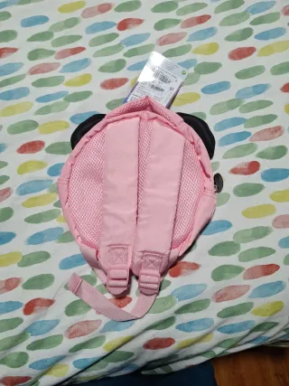 Adorable mochila con el diseño de Minnie Mouse. - Color principal rosa con detalles rojos. - Orejas y lazo característicos de Minnie. - Tirantes ajustables.