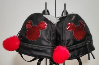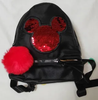 Mini mochilas con diseño de Mickey Mouse. - Color negro con detalles en lentejuelas rojas. - Adorno de pompón rojo. - Cierre de cremallera. Unidad 19€ Las dos 35€.