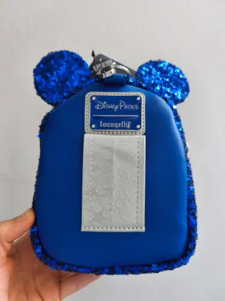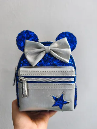 Adorable mini mochila de Minnie Mouse de Loungefly, con un diseño brillante y divertido. Forma parte de la colección Wishes Blue. Sin estrenar, conversa la etiqueta y el relleno de la mochila para que no se deforme. - Orejas de Minnie azules en relieve y lazo plateado brillante - Etiqueta Disney Parks x Loungefly en esmalte en la parte trasera - Bolsillo frontal con cremallera y detalle de estrella - Correa para la muñeca extraíble - Cremallera con logo Loungefly Medidas: 19*15*5 cm (alto x ancho x profundo) #mochila #muñequera #disney #loungefly #limitada #disneyparks #disneyland #azul