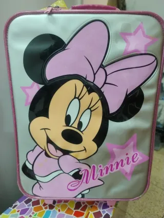 Maleta trolley con diseño de Minnie Mouse. Marca Disney. - Cuatro ruedas para facilitar el transporte. - Asa extensible para mayor comodidad. Desplegable a 2 medidas En el dorso se puede abrir una cremallera y hay asas para llevarla como mochila. Ver señales de uso en fotos.