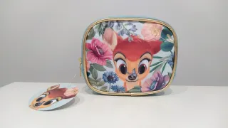 Neceser con un encantador diseño de Bambi rodeado de flores. - Estampado floral vibrante con Bambi. - Ribete dorado alrededor del neceser. - Cierre de cremallera.