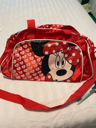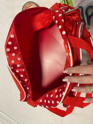Bolso infantil con diseño de Minnie Mouse. - Color rojo y blanco. - Estampado de corazones y lunares.