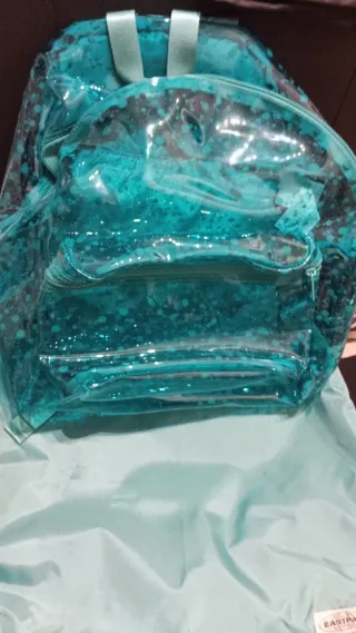 Mochila Eastpak con un diseño llamativo y moderno. - Material exterior transparente. - Estampado multicolor en tonos turquesa y negro. - Dos compartimentos principales con cremallera. - Bolsillo frontal adicional con cremallera.