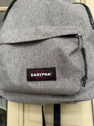Mochila Eastpak de color gris, con bolsillo frontal con cremallera y compartimento principal amplio. Cómoda y resistente, ideal para uso diario, universidad o viajes. En buen estado, cremalleras funcionando perfectamente.