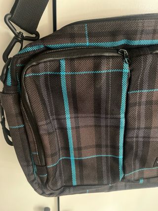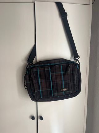 Mochila Eastpak con un diseño a cuadros en tonos marrones y azules, ideal para llevar tu portátil. - Compartimento principal espacioso. - Bolsillos exteriores adicionales. - Correa ajustable para el hombro.
