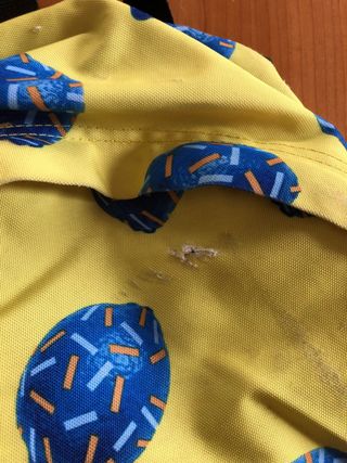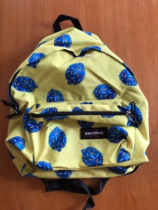 Mochila Eastpak con un divertido estampado. - Tiene una rotura en parte frontal - Color base amarillo. - Estampado de limones azules con detalles naranjas.