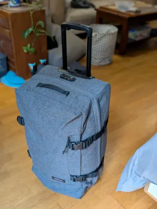 Maleta de cabina Eastpak Traverz M en color gris. Perfecta para tus viajes. - Diseño moderno y funcional. - Ruedas para facilitar el transporte. - Asa extensible. - Candado de combinación integrado. En excelente estado. Solo se usó para unos pocos viajes. H67xW35.5xD30 - 78L